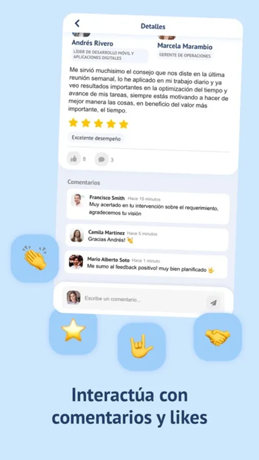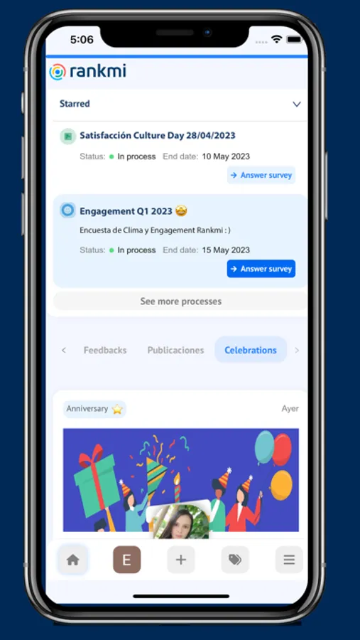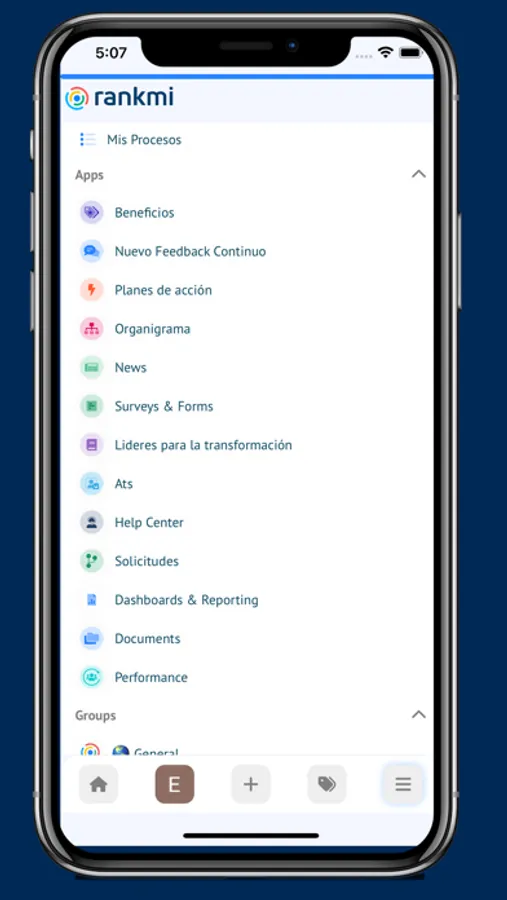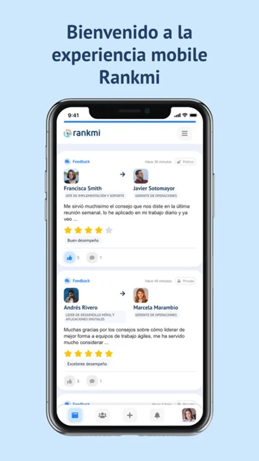 Con Rankmi, puedes realizar evaluaciones de desempeño 360, fijación de objetivos y metas, compartir feedback o reconocimientos públicos y privados, responder encuestas de clima o abiertas, publicar comunicados y dar seguimiento a los planes de acción.