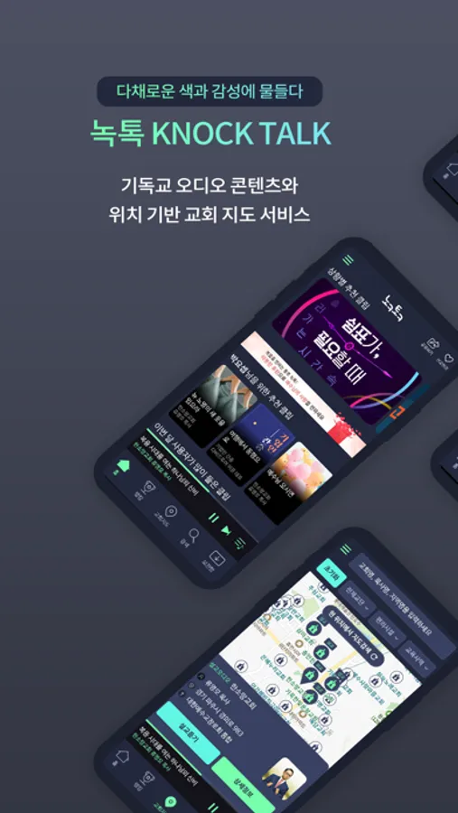 “녹톡 (Knock Talk)” 어플리케이션을 통해 기독교인들을 위한 3만여 개의 검증된 오디오 컨텐츠와, 이단성이 검증된 3만여 개의 교회들을 지도로 만나보세요.