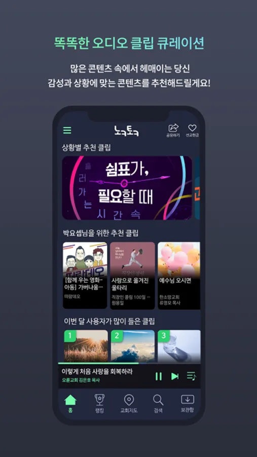 출근할 땐 찬양을, 힘들 땐 상담 프로그램을, 필요에 따라 언제 어디서든 오디오로 쉽게 만나보세요!