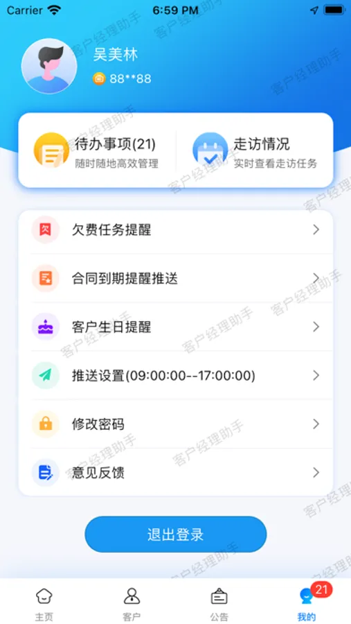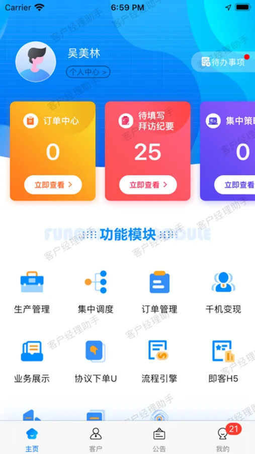 系统包括生产管理、业务办理、集中调度、订单管理、商机管理、业务展示等模块,围绕客户经理工作中的方方面面定制开发,用于帮助客户经理进行客户走访、订单制定、宣传资料展示等日常工作。