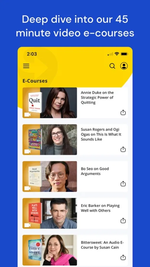 • E-courses — 45 minute master classes, in audio, video and text formats starring the authors of the Next Big Idea’s best books of the year