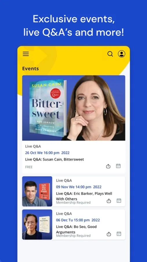 • Conversations — Watch recorded live Q&As, podcast recordings, and author chats