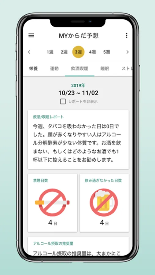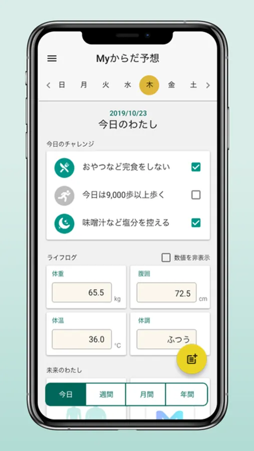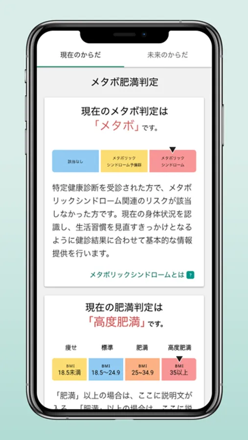 「Myからだ予想」は、個人の健康や働き方における意識改革を促すことを目的とした健康管理アプリンです。健康診断の結果等を用いて、健康の将来リスクを予測し、運動・栄養・睡眠・ストレス等の状況を評価し、個人別にカスタマイズしたアドバイスとともにわかりやすく提供します。