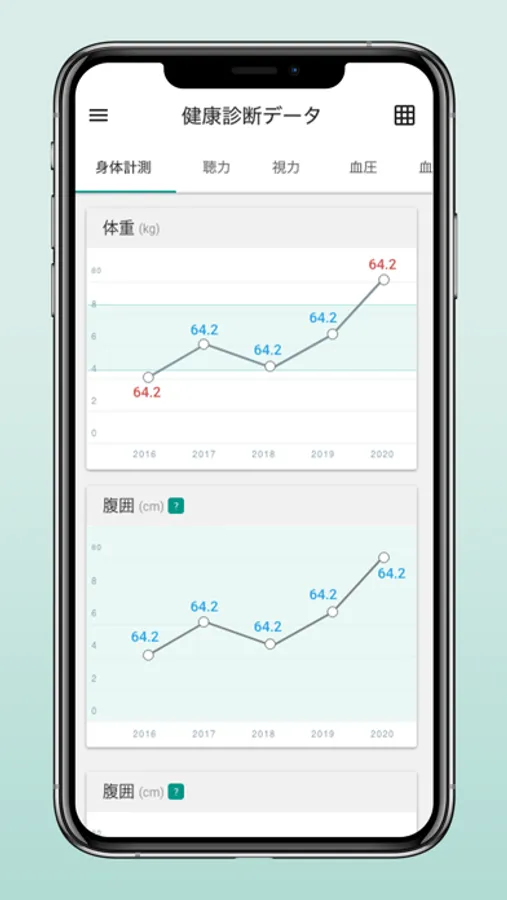 健康診断結果を気になった時にいつでもアプリでご覧いただけます(最大5回分)。グラフでデータの推移をご確認いただくことも可能です。