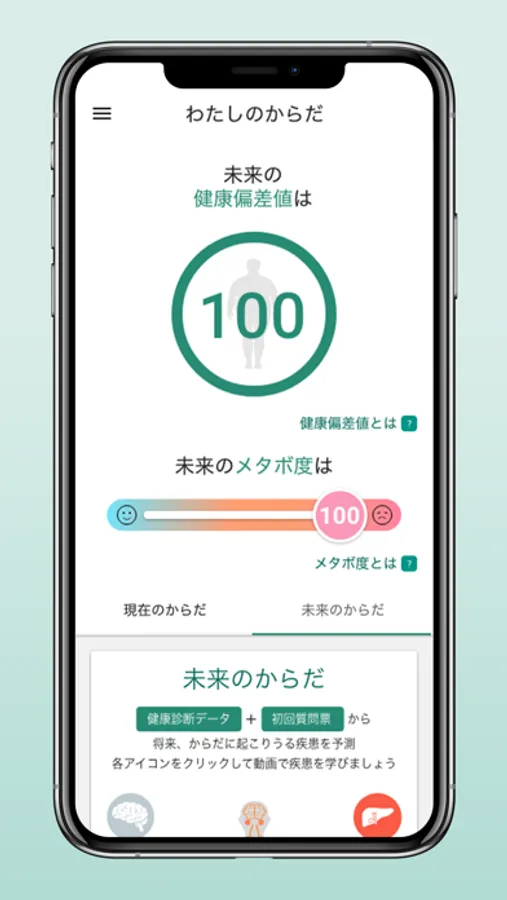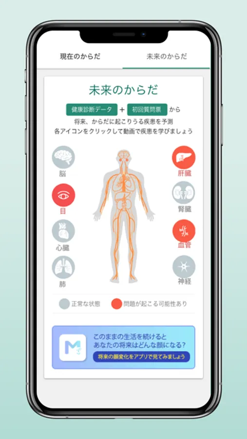 健康診断の結果から算出した「健康偏差値」や「からだに起こりうる病気の予測」により、将来の健康リスクを知ることができます。リスクの改善に取り組まなかった場合の顔イメージもご覧いただけます。