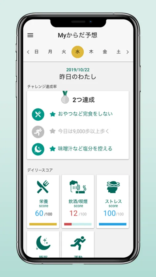 また、日々の生活状況を入力すると、デイリースコアで取組の評価をご案内します。