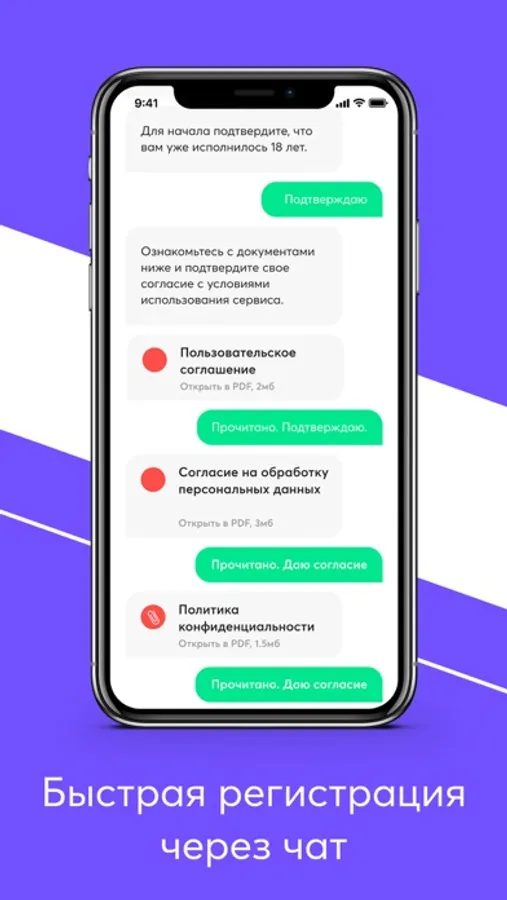 Быстрая регистрация через чат – проверка документов занимает не более 20 минут.