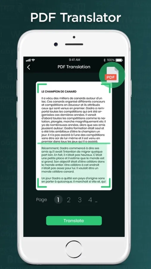TranslateCam will recognize and scan your PDF document page by page and translate it to any language you select.