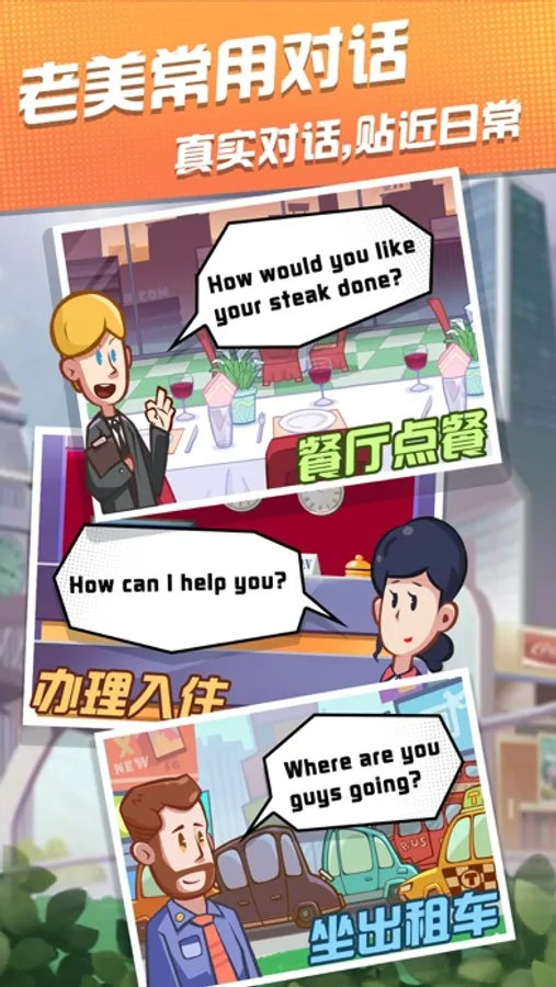 我们将学习内容以场景对话的形式展现,邀请母语人士配音,合理安排练习进度,让你在领略美国风情的同时,不知不觉中练就一口实用美语,从此出国旅游不再受语言困扰!