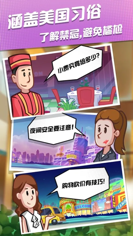 精心制作的内容涵盖了国外旅游中常见的各类场景,如海关、就餐、酒店、租车、购物等,还有美国的风景名胜。