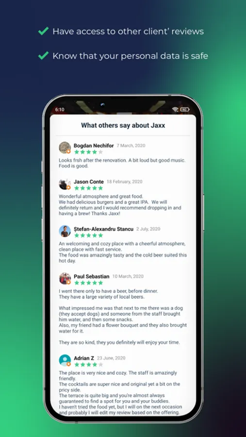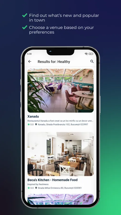 The app tells you everything you need to know about the venue: from opening hours and facilities to menu options, client reviews, and pictures.