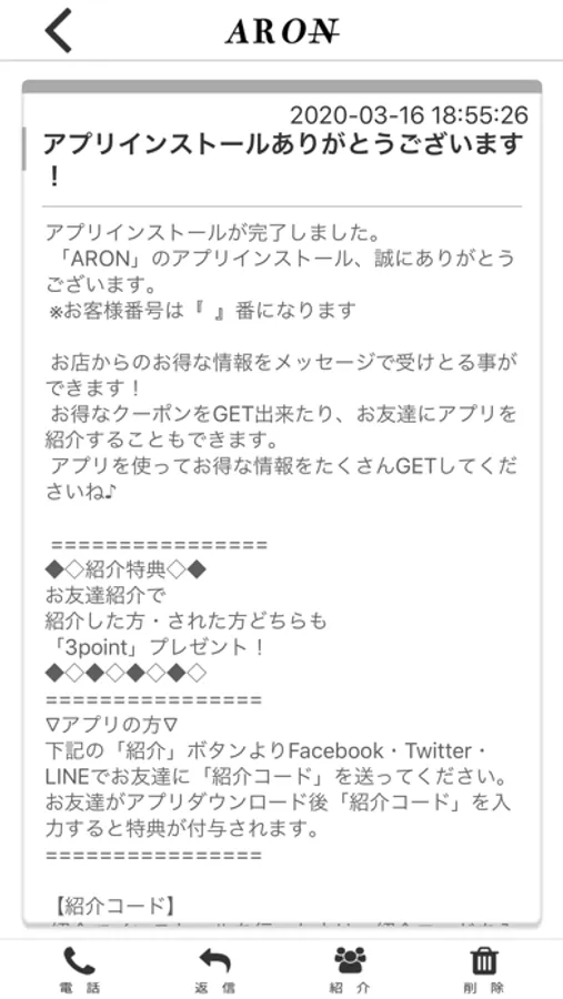 ARONのアプリをSNSを通じてお友達に紹介する事ができます。