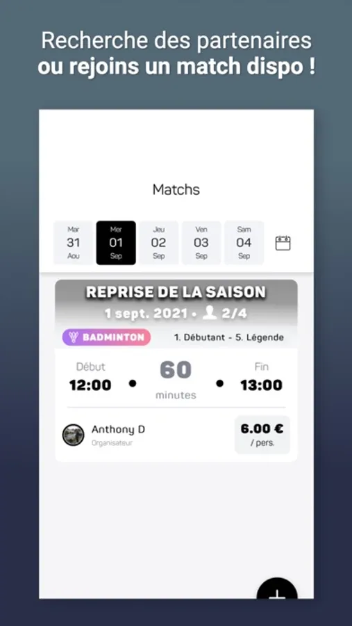 Organise tes matchs en 2 clics et rejoins une communauté de joueurs de foot et de badminton autour de toi !