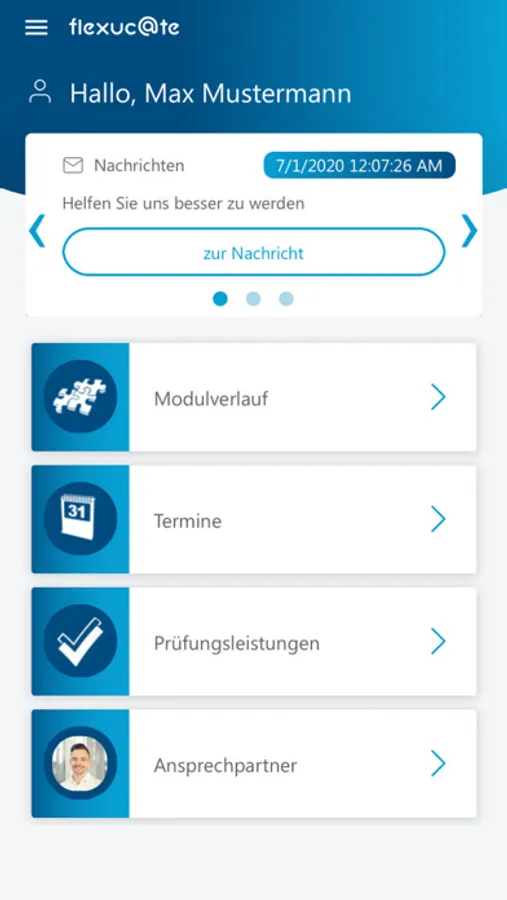 Schau dir deinen Studienverlauf, Lehrmaterialien & kursrelevanten Daten an. Bekomm mit einem Klick eine Übersicht über deine Präsenzphasen, Webinar- und Prüfungstermine. Werde sofort benachrichtigt, wenn es etwas Neues gibt.