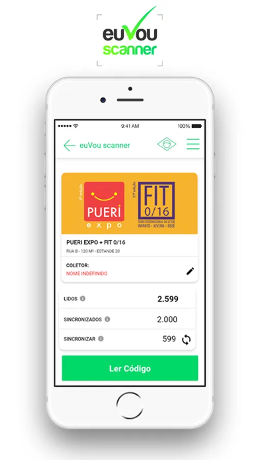 - Leitura de QR Codes ou Barcodes das credenciais dos visitantes do seu estande