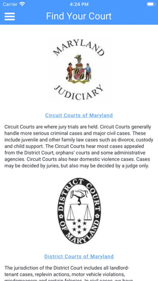 Maryland Court Help brings together tools and resources developed by the Maryland Judiciary and others to help Marylanders use the courts or find legal help. Lean about Maryland law, find a lawyer or mediator, watch videos on how to use the courts, and even call or chat with a lawyer at the Self-Help Center.