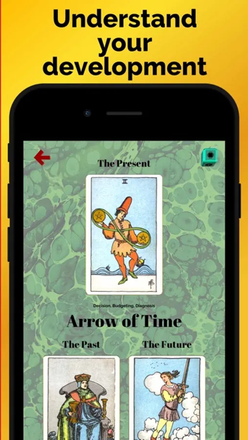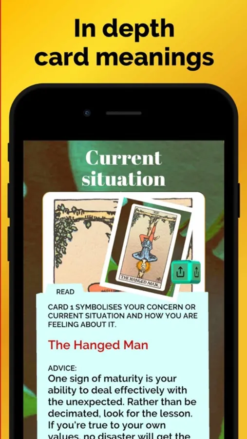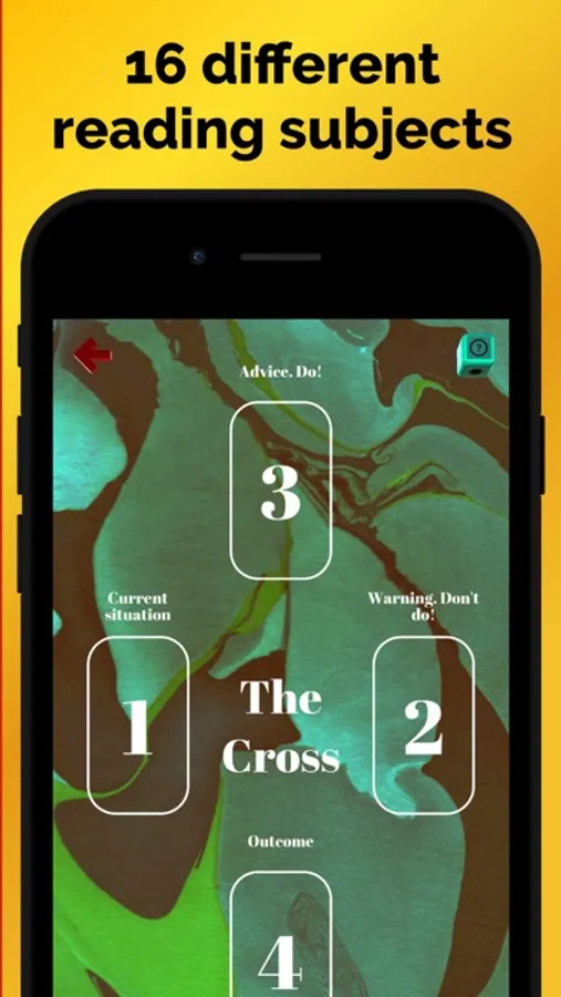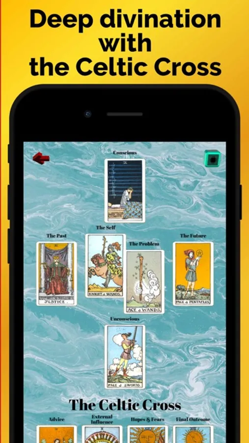 The reading spreads offer subjects such as receiving advice, reflecting the self, analysing projects, understanding relationships and assessing paths for personal development. They range from quick and easy with 2 or 3 cards to deep divination readings with 10 cards like the Celtic Cross. They are beautifully designed with exquisite marbling backgrounds and elegant typography or can be saved for later and shared with friends in messenger apps and on social media.