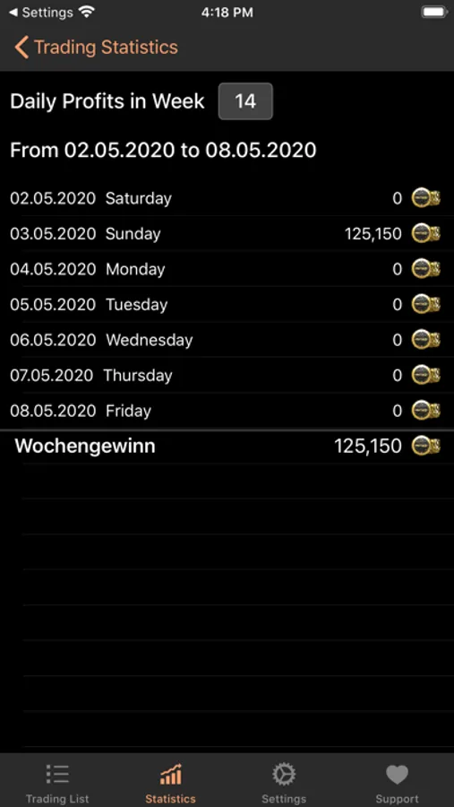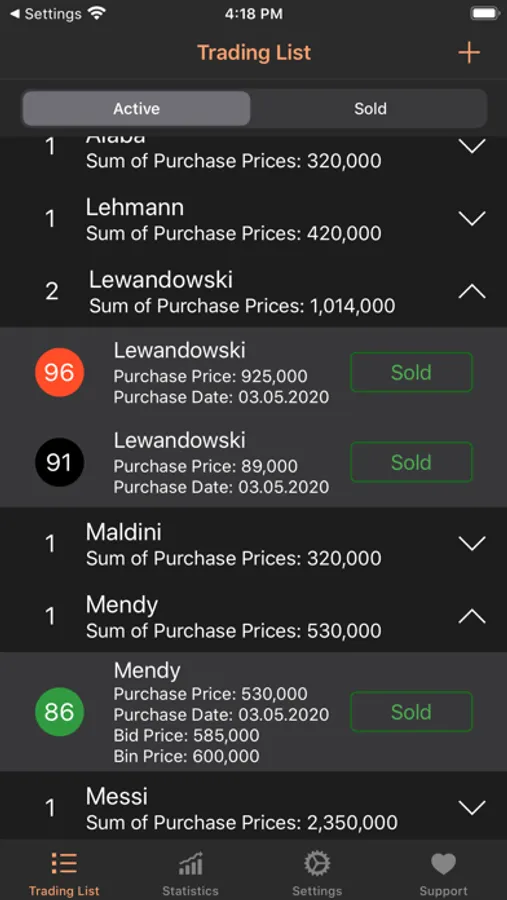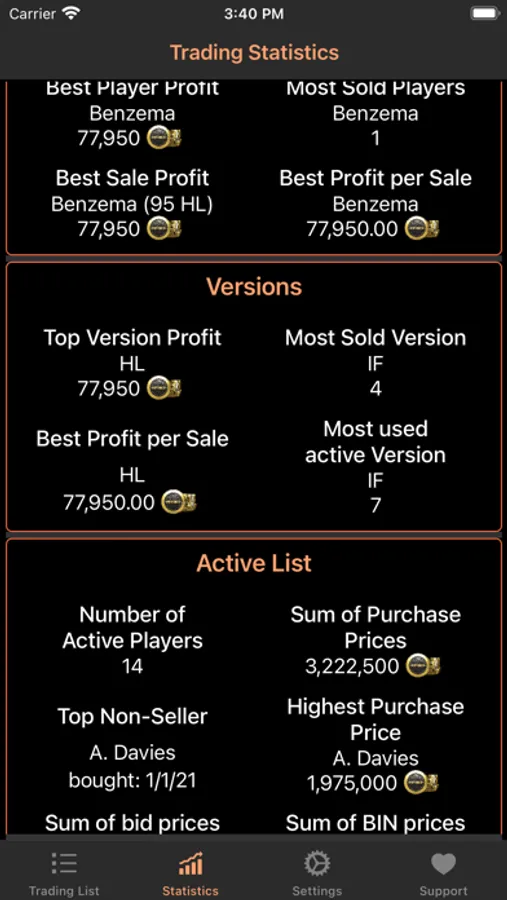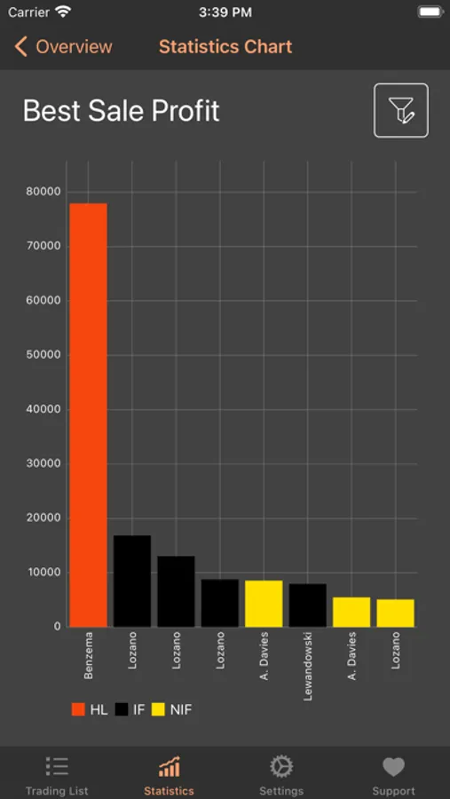 Keep track of which players you have bought for how much, and for what price you are most likely to sell a player. In addition, you can see various statistics, like a weekly overview of your daily profits. More statistics will be added in future updates.