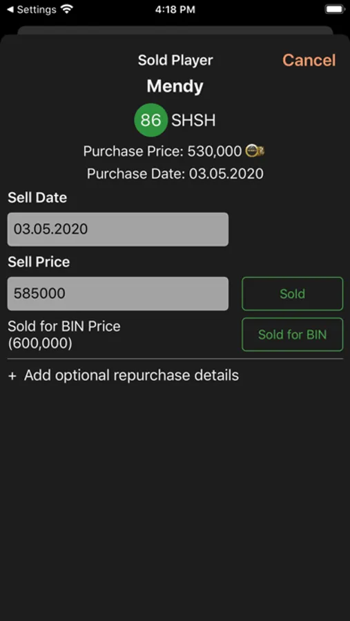 With futistics you can record all your trading activities in Ultimate Team. Register purchased players with all details, such as purchase price, purchase date, etc. Set the status to 'sold' and enter the sale price as soon as you sold it. The profit will be calculated automatically.