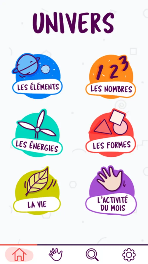 - Sélectionnez un univers à explorer : Les Formes, les Nombres, les Éléments, la vie et de nombreux autres !