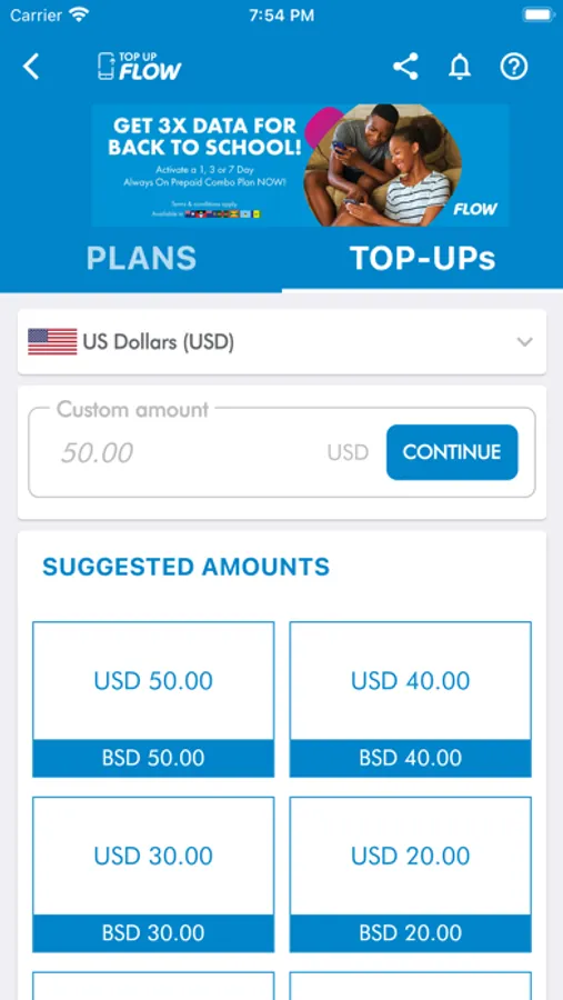 Top up any Flow number in a new and simple way. You will be able to Top up an amount or select a plan as you wish.