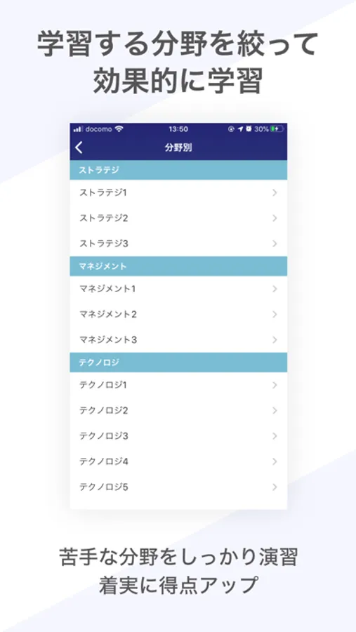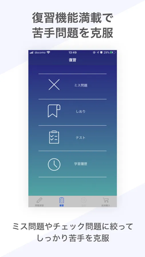 テスト機能、ミス問題だけを復習、苦手な問題をチェックしてチェック問題のみ復習で着実にレベルアップ。