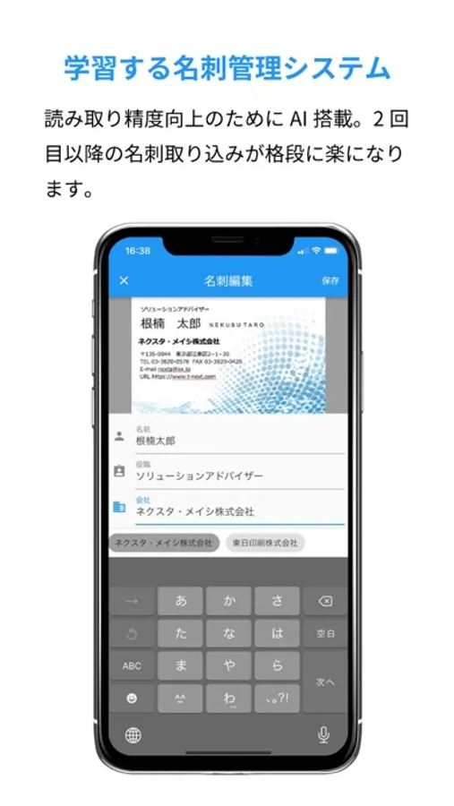 - Equipped with AI for reading business cards. Even if there is an error in reading, if you correct it once, candidates will be displayed below the input character string in the next and subsequent edits, and the more you use it, the more accurate it will be.