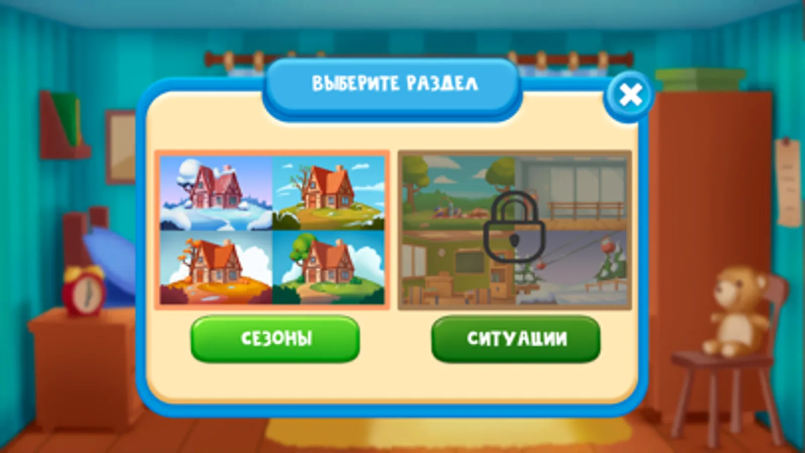 ○ Тестирование. Задается сезон или ситуация и представляется ряд картинок, ребенок должен выбрать те, которые соответствуют сезону или ситуации.