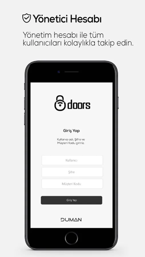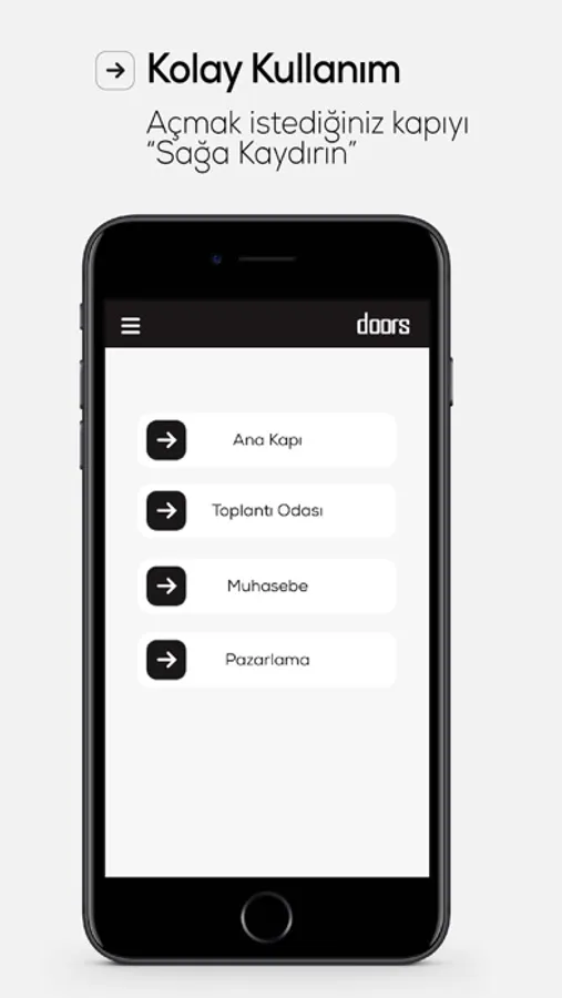 Doors kapı uygulaması kullanım bakımından son derece kolaydır, uygulamaya başlamadan önce web yönetim paneli üzerinden kullanıcı tanımlaması yapılması gerekmektedir, Doors uygulmasına kullanıcı adı ve şifre ile giriş yapılarak telefon numarasına gelen sms doğrulaması ile kullanıcı girişi gerçekleşir, bu sayede yetkisi olmayan kullanıcılar sisteme giriş yapamazlar.