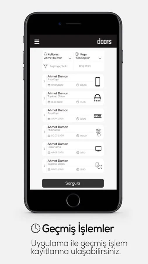 Doors uygulaması ile kullanıcıların giriş çıkışlarını takip ederek günlük kayıtlarına ulaşabilirsiniz. Doors uygulması ister kapı hedefli, ister kullanıcı bazlı olarak günlük giriş çıkış kayıtlarını tutmaktadır, bu sayede hangi kullanıcının hangi kapıdan saat kaçta giriş çıkış yaptığını veya belirlenen kapıdan hangi kullanıcıların hangi tarih ve saat aralığında giriş çıkış yaptığını kolaylıkla kontrol edebilirsiniz.