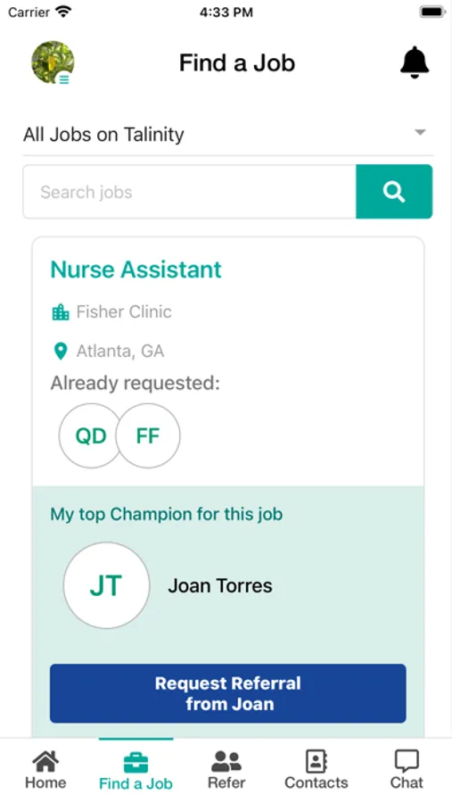 Talinity uses AI to match you and your network to job opportunities. But it’s more than just an algorithm, we maintain the human touch. When one of your contacts sees that you match a job, they decide if they think you’d be a good fit, and if so reach out to see if you agree. If so, they can refer you directly to the hiring manager. When a company gets a referral from Talinity, they pay attention - because the community has made sure that the candidate doesn't just match the position on paper, they genuinely match and are interested in the opportunity.