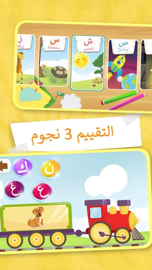 • الحروف: تعلم وكتابة الحروف الكبيرة والصغيرة مع قطار متحرك ولحن لطيف.