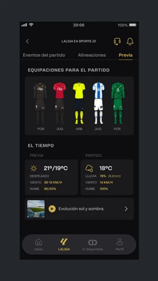 Accede a información exclusiva relacionada con la previa de tu partido: tipo y estado del césped, información detallada del estadio, meteorología, alineaciones, equipaciones de juego, composición del equipo arbitral y estadísticas colectivas e individuales. Todo está pensado para que puedas concentrarte en lo que realmente importa.
