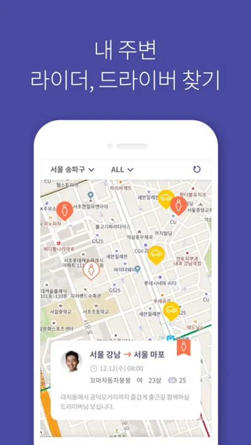 출퇴근과 상관없이 24시간 매칭이 가능한 1회성 카풀 어플리케이션입니다.