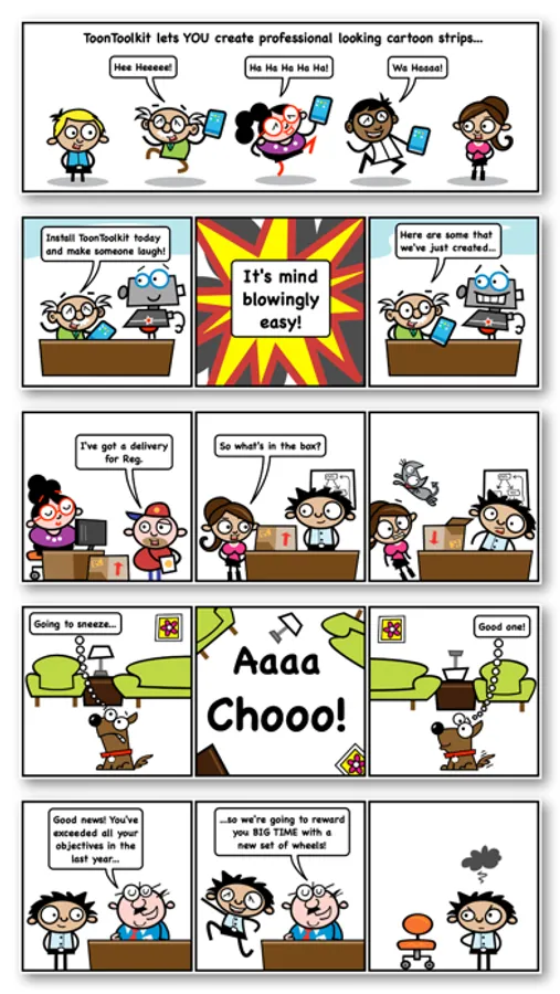 Want to make your friends, family and colleagues laugh or show the world you're a comedy genius ? Then get ToonToolKit and start creating your very own professional looking cartoon strips in seconds.