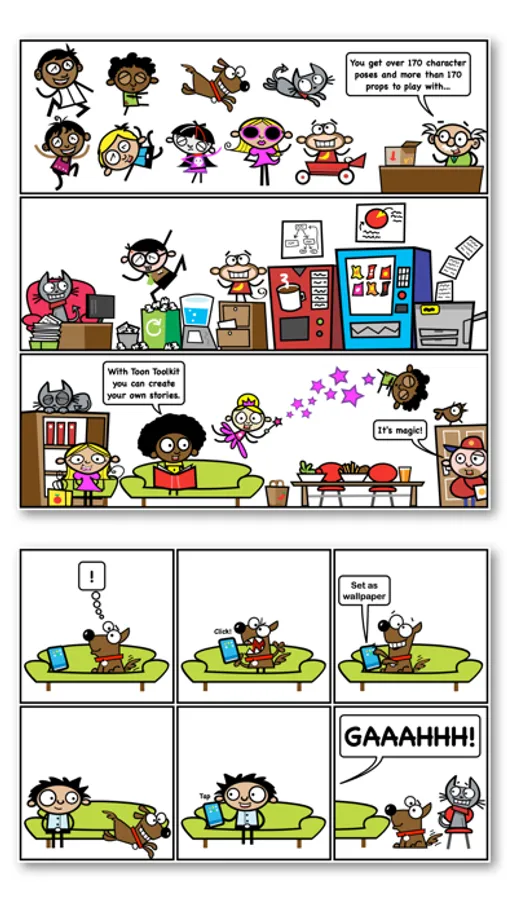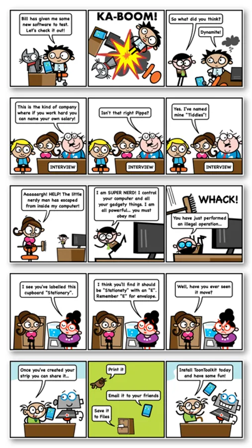Imagine it. Last night's party antics re-created by you for all to laugh at again. Tomorrow's presentation suddenly more interesting and funny. Next week's homework livened up. A side-splitting, personal birthday message for Dad. A daily cartoon tweet to get more followers. And what better than using your own cartoon strip to send original messages to your loved one.
