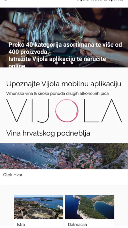 Vijola mobilna aplikacija za naručivanje. Aplikacija sadrži preko 500 vrsta kako vina tako i ostalog alkoholnog asoritmana. Vijola Hvar d.o.o