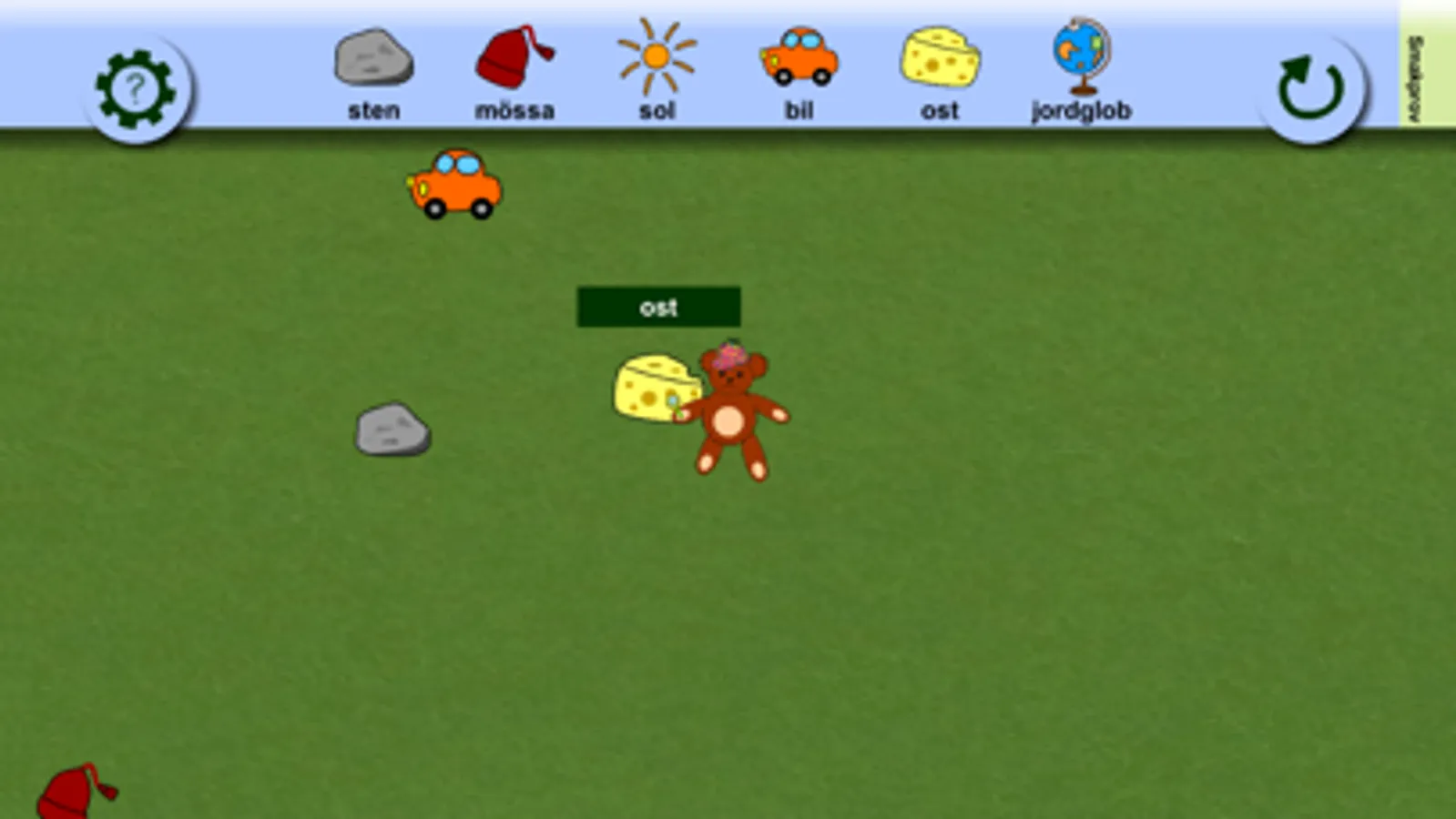 Här kan du välja att slå på text. Då syns ordet både som bild och text i den blå listen och du får även se ordet på spelplanen när nallen undersöker saken.