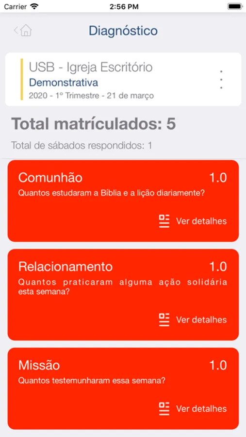 É o aplicativo que traz o cartão de chamada de escola sabatina em formato digital. Nele você pode cadastrar os alunos de cada unidade, gerenciar a chamada e os apontamentos a cada semana, acompanhando assim o diagnóstico semanalmente ou trimestralmente.