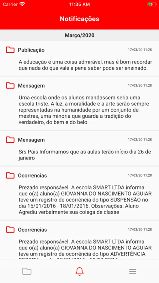 Avisos, ocorrências escolares, declaração de pagamentos, enfim....