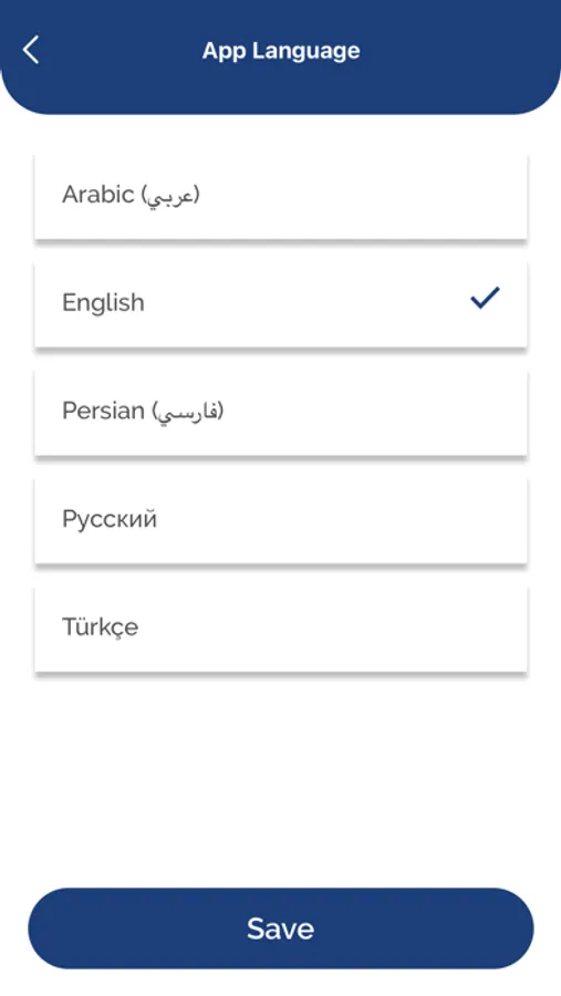 App Languages are available: English, Pусский, Türkçe, Arabic (عربي), and Persian (فارسي).