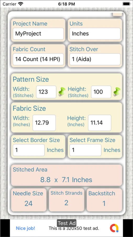 Borders or frames can be optionally added, and it's simple to change the stitch count or units. Multiple units are supported, including Inches, cm, mm, Feet and Metres.