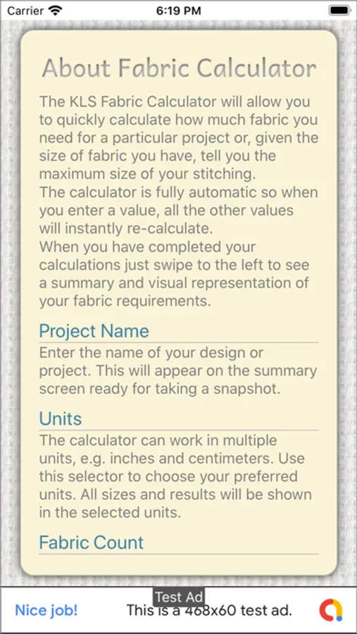 The KLS Fabric Calculator will allow you to quickly calculate how much fabric you need for a particular project or, given the size of fabric you have, tell you the maximum size of your stitching. The calculator is fully automatic so when you enter a value, all the other values will instantly re-calculate. When you have completed your calculations just swipe to the left to see a summary and visual representation of your fabric requirements.