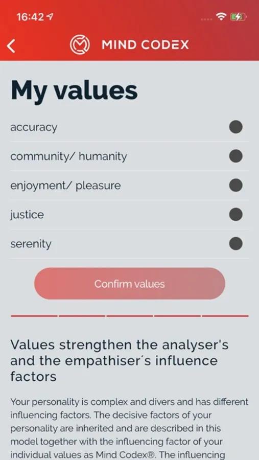 Learn which values, strengths, needs and potentials you possess and how you can use them successfully to achieve your personal goals. Discover your personal Mind Codex® for your personal success! Grasp your personal Mind Codex® quickly, which is presented to you in form of a diamond. For this, you will receive a personalized access to the online analysis from a licensed Mind Codex® Trainer (included in the app). We look forward to welcoming you to a face-to-face or online seminar. The app enables you to record your 5 most important values from around 200 values. The knowledge about the values is like a navigation system to your personal success. At our Mind Codex® seminars and coaching sessions you will learn more about your strengths, potentials, and guiding principles. The sum of all this is your personal Mind Codex® for your personal success!