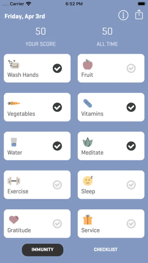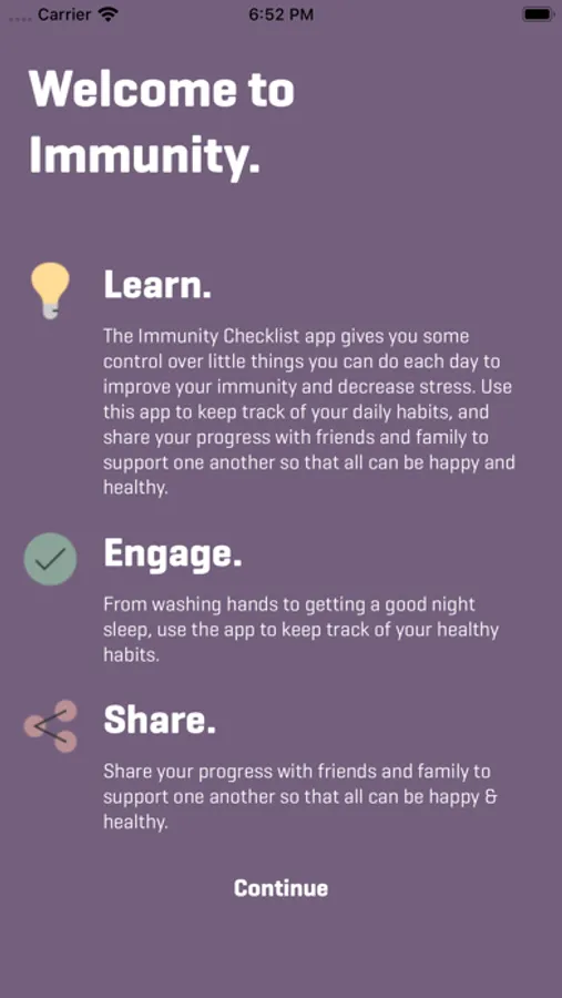 The Immunity Checklist app gives you some control over little things you can do each day to improve your immunity and decrease stress. Use this app to keep track of your daily habits, and share your progress with friends and family to support one another so that all can be happy and healthy.