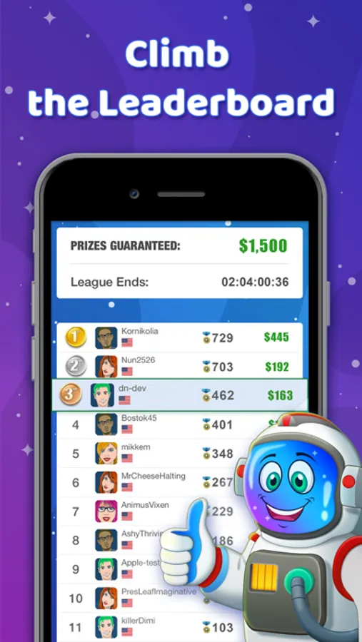 - Real Cash Prizes - Compete against real opponents, climb on the leaderboard and win real cash prizes!