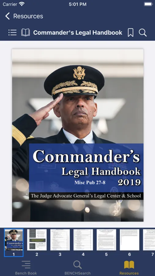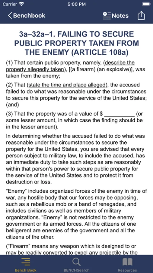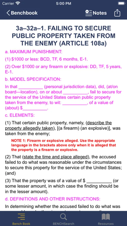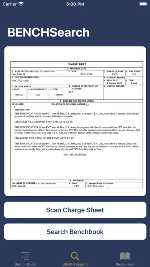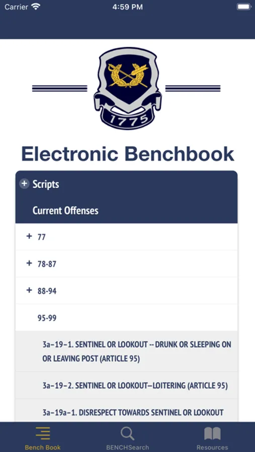 The Benchbook can be searched manually or you can take advantage of BENCHSearch. BENCHSearch allows you to scan a copy of your charge sheet using your device's camera and, using optical text recognition, pull the applicable instructions for the featured punitive articles.