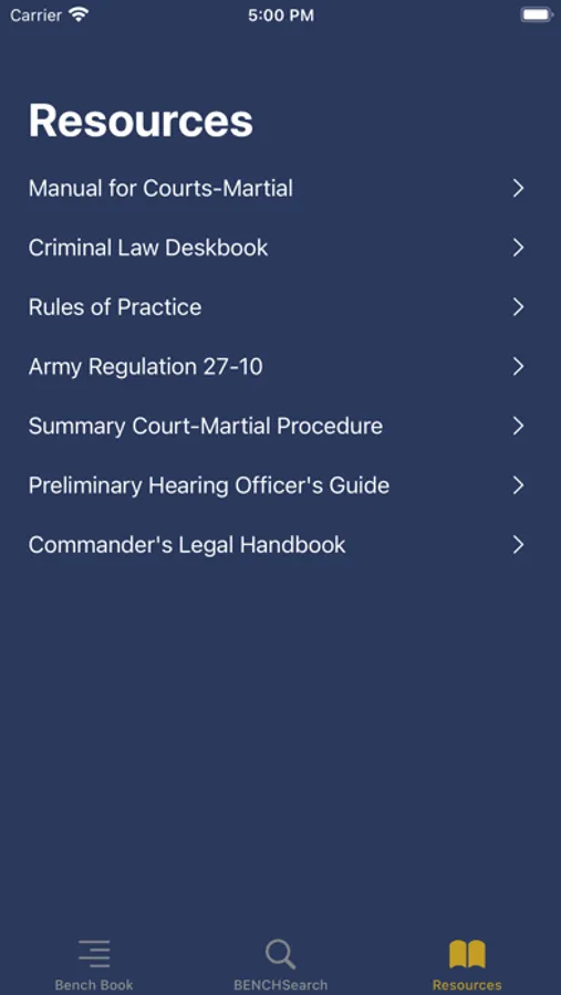 Lastly, the App contains full offline copies of the Manual for Courts-Martial, the Criminal Law Deskbook, and the Rules of Practice along with a number of other regulations and guides.