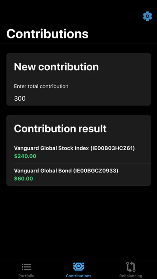 - When you are done with this, you can now make a new contribution. For doing so, just enter the total amount you want to spend. The app will calculate the amount you must invest on each fund, based on the percentage you decided on your portfolio.