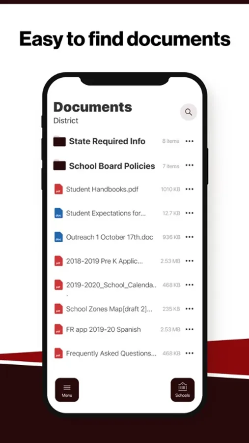The event section shows a list of events throughout the district. Users can add an event to their calendar to share the event with friends and family with one tap.